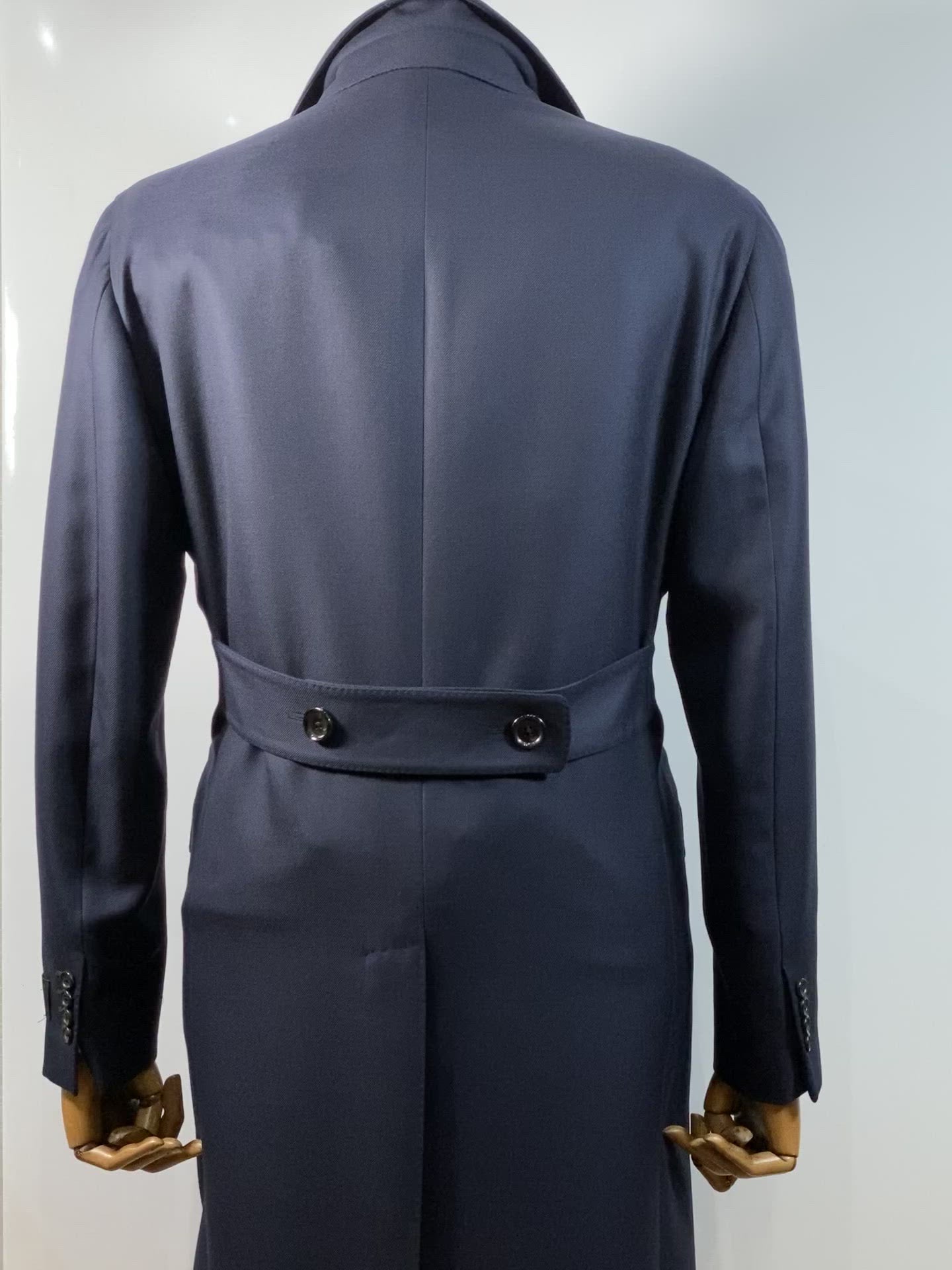 Hand Made navy wool unlined coat with half belt. Storm proof